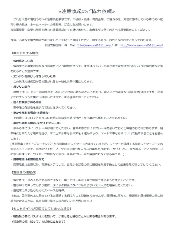 先日の大雪で多くの大雪で孤立している集落等の発生、車中泊の多くの方々が居ます。